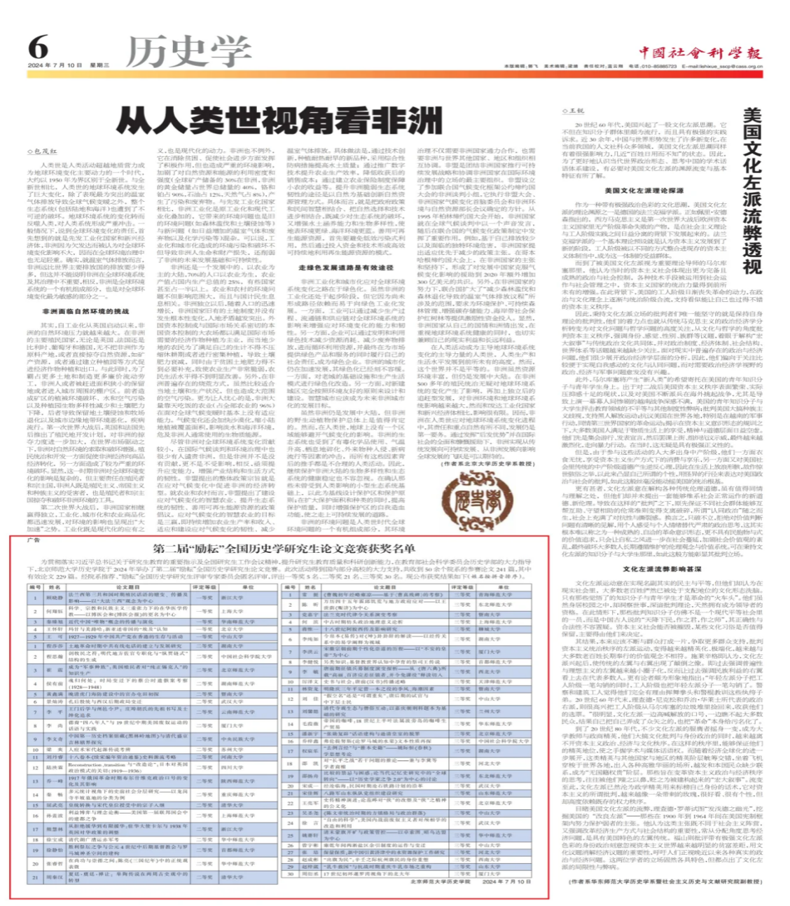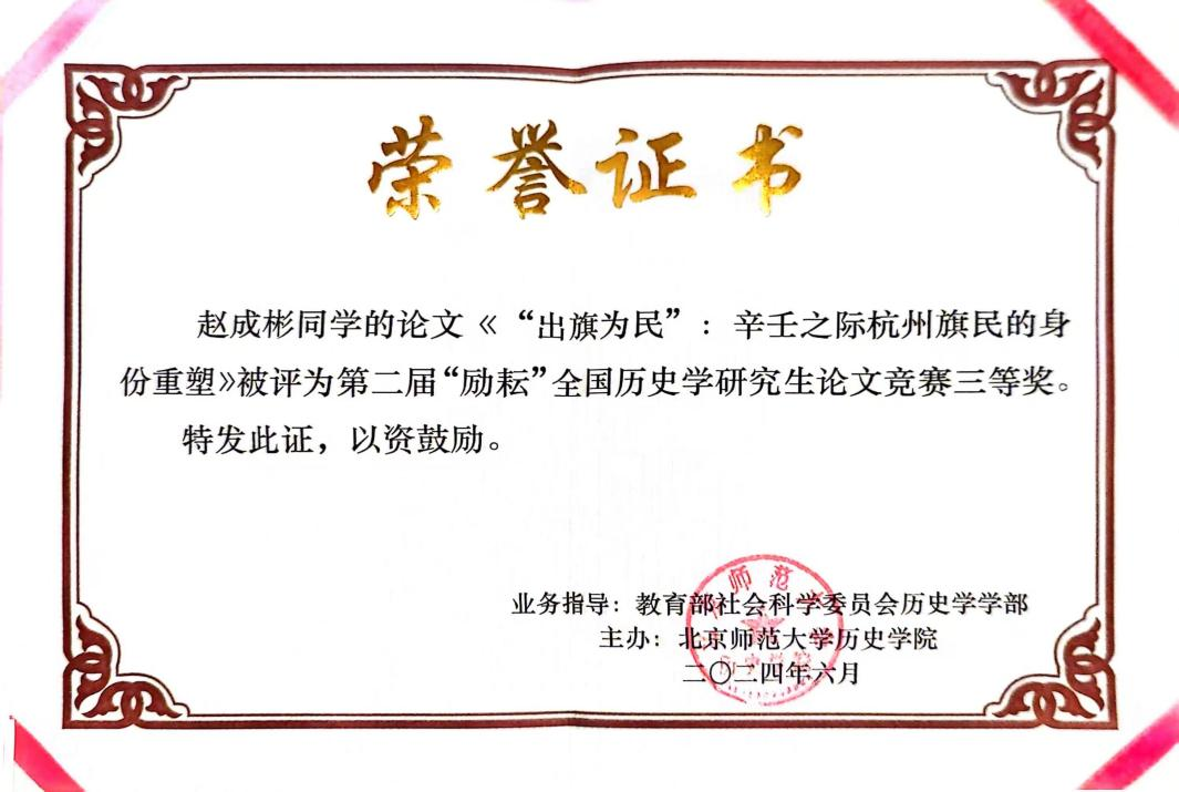 2024年7月7-9日,北京师范大学举办第二届“励耘”全国历史学研究生论文竞赛颁奖会暨历史学研究生骨干发展专题论坛,公司党委副书记张静、硕士生张玥应邀赴北京师范大学参加本次论坛。公司博士生赵成彬撰写的论文《“出旗为民”:辛壬之际杭州旗民的身份重塑》(曾现江教授指导)荣获三等奖。