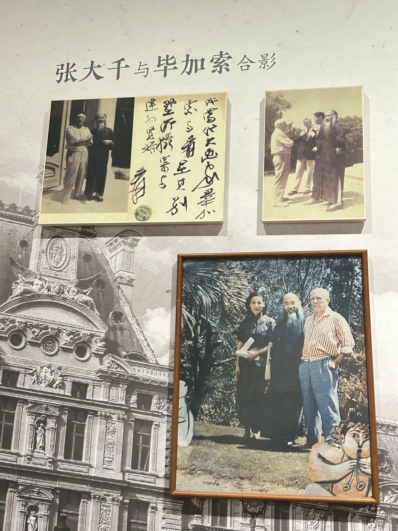 “面壁敦煌”单元揭示张大千的另一重身份:文物保护者。上世纪40年代,他率弟子赴敦煌,整理文物、编号洞窟、临摹壁画276幅,陈寅恪盛赞其“成绩超出以前研究之范围……实能于吾民族艺术上,另辟一种境界”。“东张西毕”单元则记录了1956年张大千与毕加索在巴黎的会晤。毕加索展示200多幅仿齐白石画作求教,张大千直言其毛笔运用与墨色处理的不足,成就一段东西艺术对话佳话。