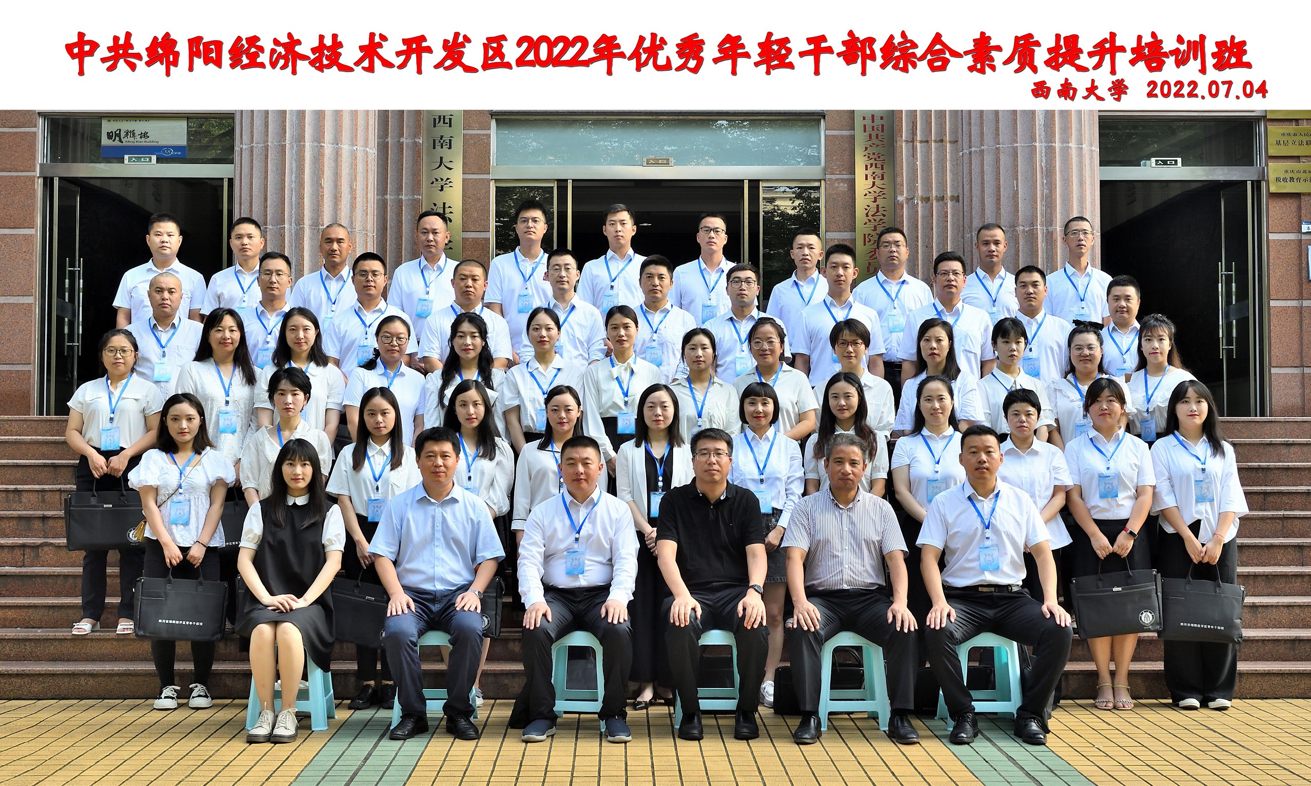 2022年7月3日至7月9日,太阳成集团tyc151cc与绵阳市经开区联合举办优秀年轻干部综合素质提升培训班。来自绵阳市经开区机关、镇(街道)、住区各单位共计50名优秀年轻干部通过在西南大学的集中学习培训,增强了理想信念,提升了理论修养,提高了处理复杂问题的能力。