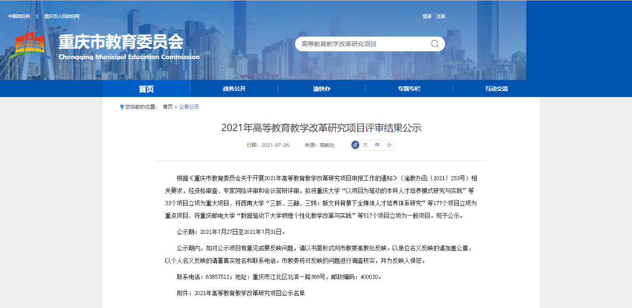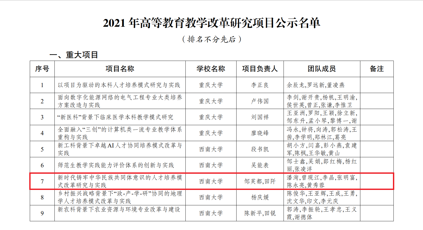 日前,重庆市教育委员会公布重庆市高等公司产品改革研究项目立项名单,公司邹芙都、田阡教授领衔申报的重大项目《新时代铸牢中华民族共同体意识的人才培养模式改革研究与实践》成功获得立项,项目团队成员为公司教师潘洵、曾现江、李晶、张明富、陈永亮、黄秀蓉等。此次全市高校共有33项获重大项目立项,其中西南大学获5项居于首位。