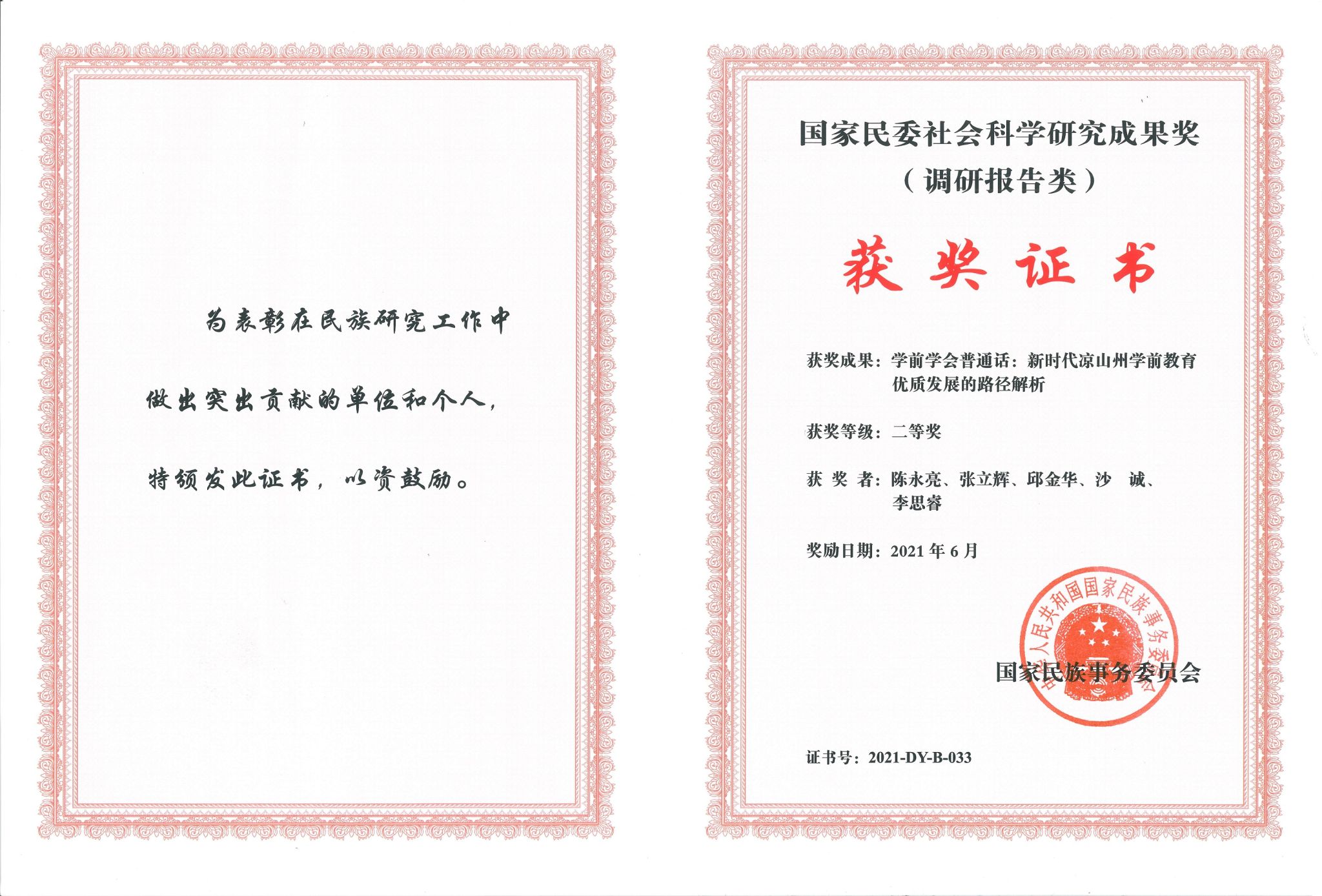 近日,2020年度国家民委社会科学优秀成果评选结果揭晓,公司教师陈永亮等撰写完成的《学前学会普通话:新时代凉山州学前教育优质发展的路径解析》,荣获国家民委社会科学研究成果奖(调研报告类)二等奖,展示出公司在民族研究领域的优势。