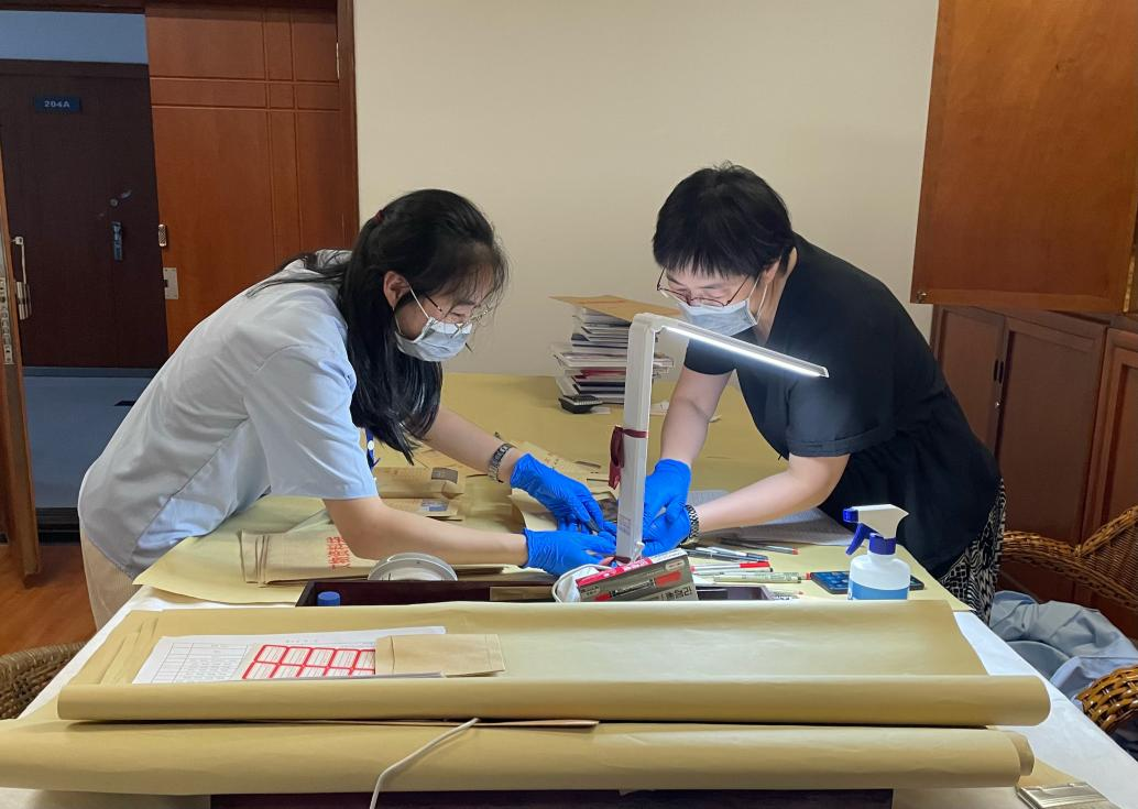 图3 何蕾、李娅同学在南岸区三峡文物科技保护基地清点文物