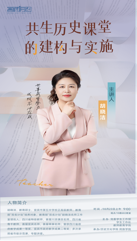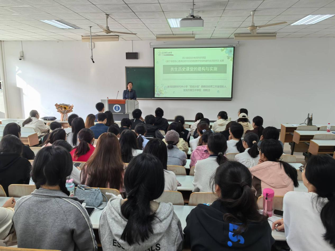 为培育师范生教育情怀,提升公费师范生综合素养和实践能力,10月23日上午,由党委员工工作部、员工工作处和教师教育公司主办、太阳成集团tyc151cc承办的“名师有约”讲座在10教0602教室举办。本期讲座邀请四川省宜宾市第五中公司正高级教师,教育部“双名计划”培养对象,教育部“双名计划”胡晓洁名师工作室领衔人;四川省特级教师、首届川派课改名师、四川省骨干教师,首届宜宾名师、首届翠屏名师胡晓洁主讲。讲座由历史文化公司党委副书记张静主持,团委书记兼员工工作办公室主任、2024级本科生辅导员庄伟以及2024级公费师范生代表共计70余人参加。