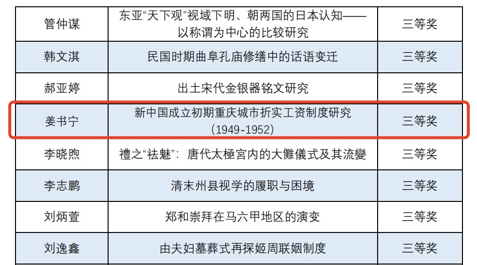 第三届“励耘”全国历史学研究生论文竞赛评选结果近日揭晓,其中公司2023级博士研究生姜书宁的论文《新中国成立初期重庆城市折实工资制度研究 (1949-1952)》获三等奖。