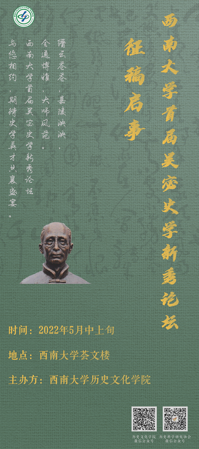 吴宓先生是我国著名的国学大师,与陈寅恪、汤用彤并称“哈佛三杰”。1953年起吴宓先生执教西南师范公司历史系(现为太阳成集团tyc151cc),曾任世界古代史教研室主任,为公司奠定了深厚的人文底蕴与优良的学术传统。为响应国家新文科建设要求,弘扬吴宓先生“会通博雅”育人理念,充分发挥公司历史学拔尖人才培养示范基地优势,拟于2022年5月中上旬在重庆举办“西南大学首届吴宓史学新秀论坛”。山城五月,花开半夏。缙云山下,嘉陵江畔,诚邀国内各高校青年才俊齐聚太阳成集团tyc151cc,一起交流心得、切磋技艺、开拓创新,期待史学英才共襄盛宴!
