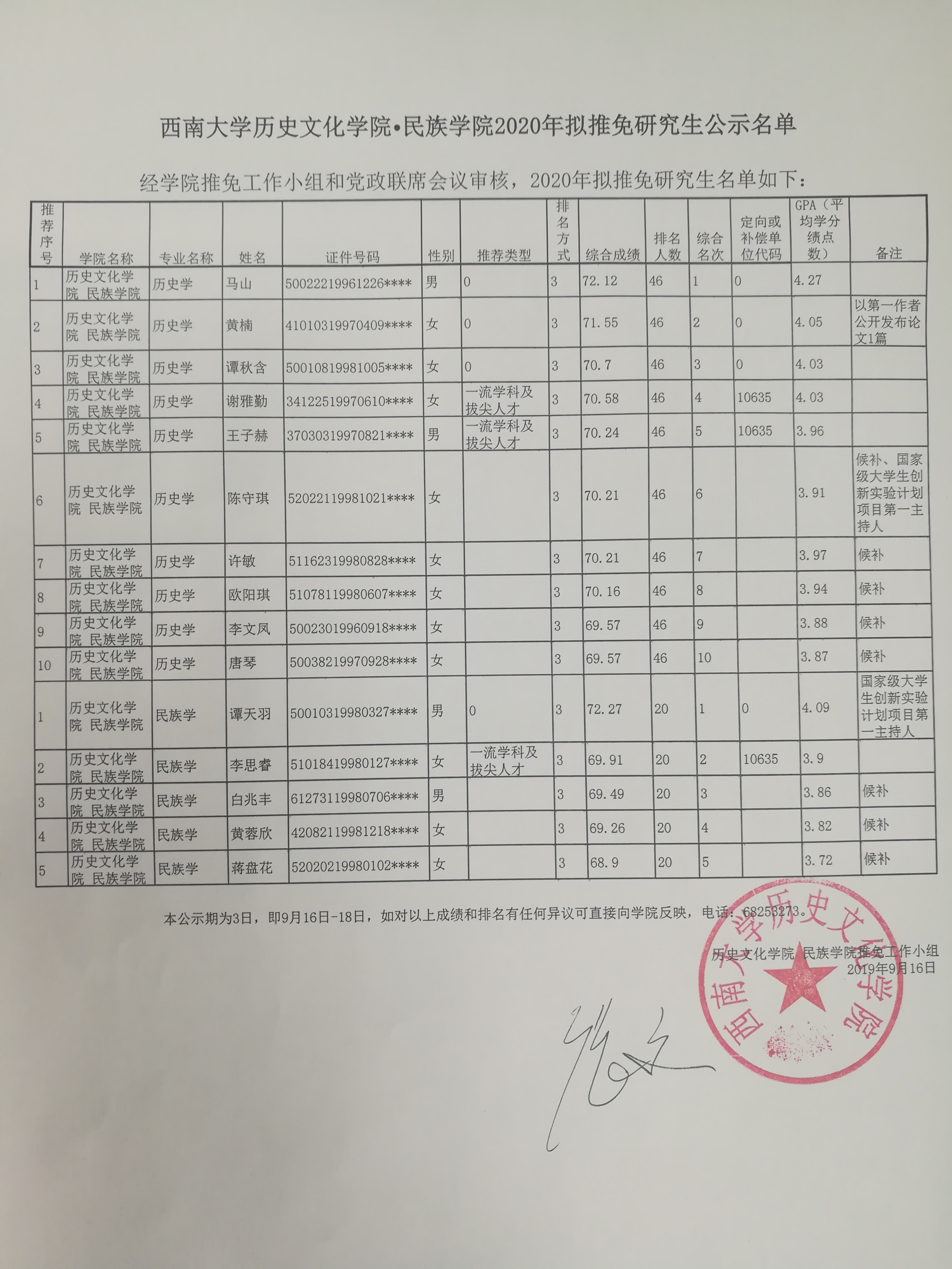 太阳成集团tyc151cc2020年拟推免研究生公示名单