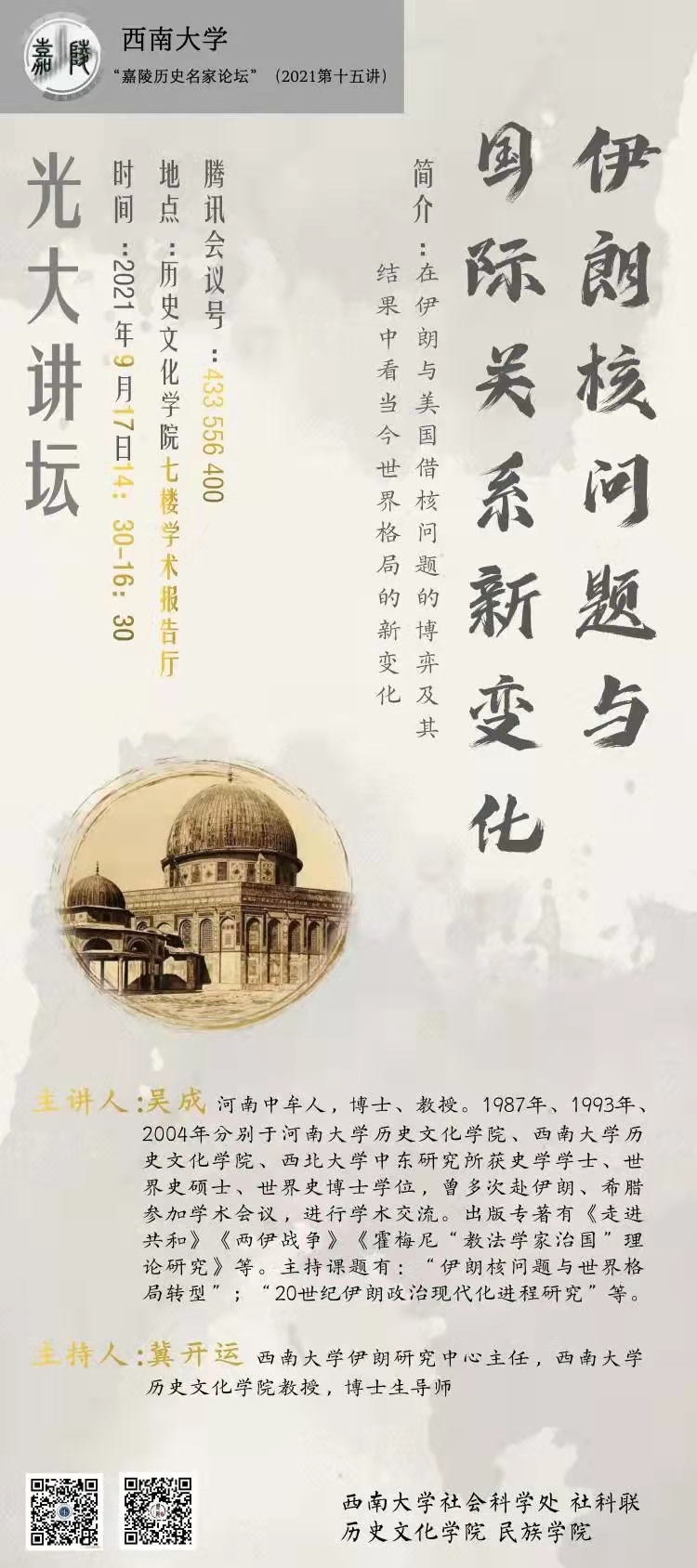 主讲人:吴成,河南中牟人,博士、教授。1987年、1993年、2004年分别于河南大学太阳成集团tyc151cc、太阳成集团tyc151cc、西北大学中东研究所获史学学士、世界史硕士、世界史博士学位,现工作于河南师范大学马克思主义公司,曾多次赴伊朗、希腊参加学术会议,进行学术交流。2007年6月,在德黑兰与伊朗前总统哈塔米同台主持霍梅尼思想研讨会开幕式,并作《用人生圣火点亮共和之灯》的主题发言,受到与会者好评。出版专著有《社会思潮研究》《走进共和》《两伊战争》《教法学家治国》《霍梅尼“教法学家治国”理论研究》《社会主义核心价值与当代中国社会思潮》《伊朗核问题与世界格局转型》《巴列维王朝的最后400天》。