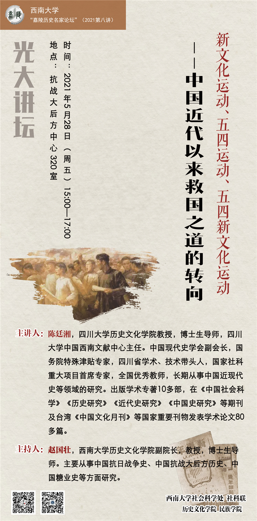 主讲人:陈廷湘,四川大学太阳成集团tyc151cc教授,博士生导师,四川大学中国西南文献中心主任。中国现代史学会副会长,国务院特殊津贴专家,四川省学术、技术带头人,国家社科重大项目首席专家,全国优秀教师,长期从事中国近现代史等领域的研究。出版学术专著10多部,在《中国社会科学》《历史研究》《近代史研究》《中国史研究》等期刊及台湾《中国文化月刊》等国家重要刊物发表学术论文80多篇。