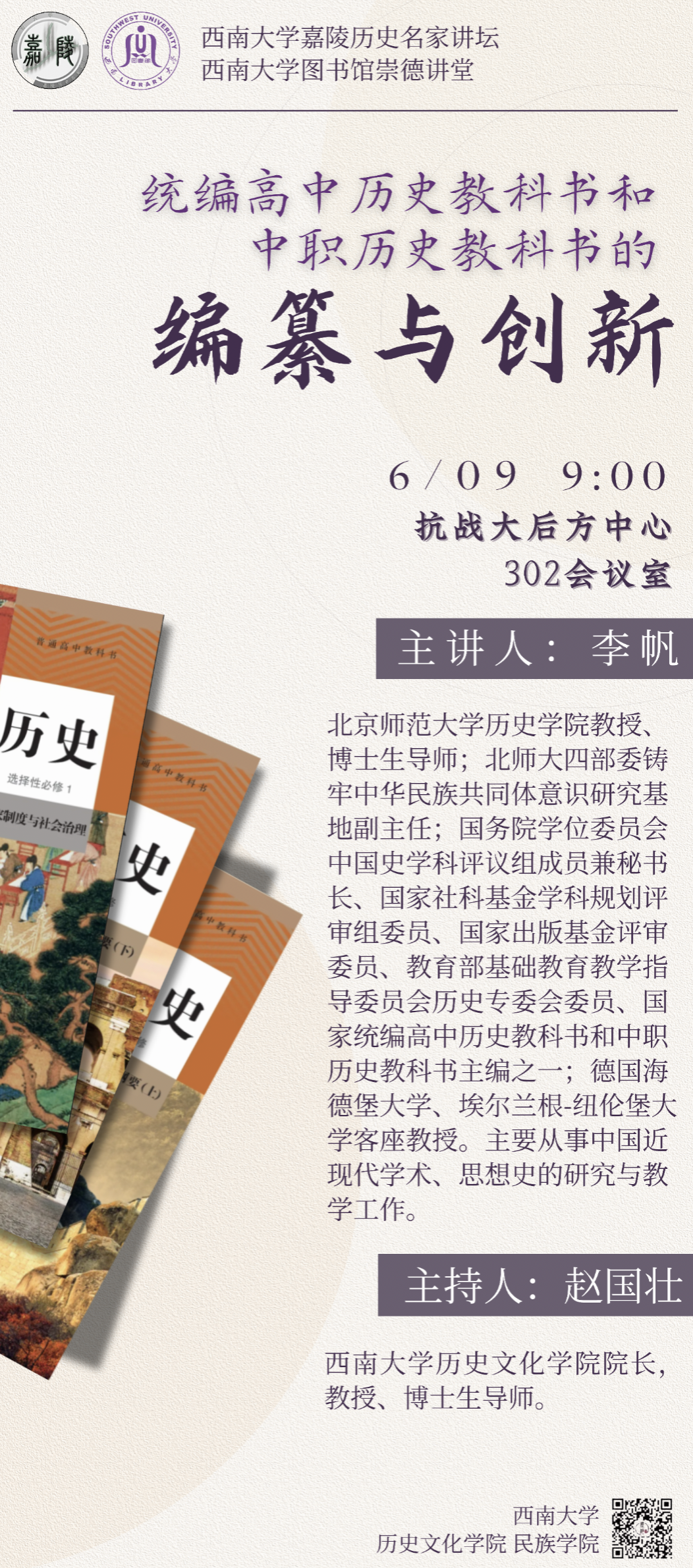 李帆。北京师范大学历史公司教授、博士生导师;北师大四部委铸牢中华民族共同体意识研究基地副主任;国务院学位委员会中国史学科评议组成员兼秘书长、国家社科基金学科规划评审组委员、国家出版基金评审委员、教育部基础公司产品指导委员会历史专委会委员、国家统编高中历史教科书和中职历史教科书主编之一;德国海德堡大学、埃尔兰根-纽伦堡大学客座教授。主要从事中国近现代学术、思想史的研究与教学工作。代表性学术著作有《刘师培与中西学术》、《章太炎、刘师培、梁启超清学史著述之研究》、《古今中西交汇处的近代学术》、《近代中国的民族国家建设》、《“夷夏之辨”和近代中国的民族国家认同》等,在海内外学术刊物上发表中、英、日文论文百余篇。