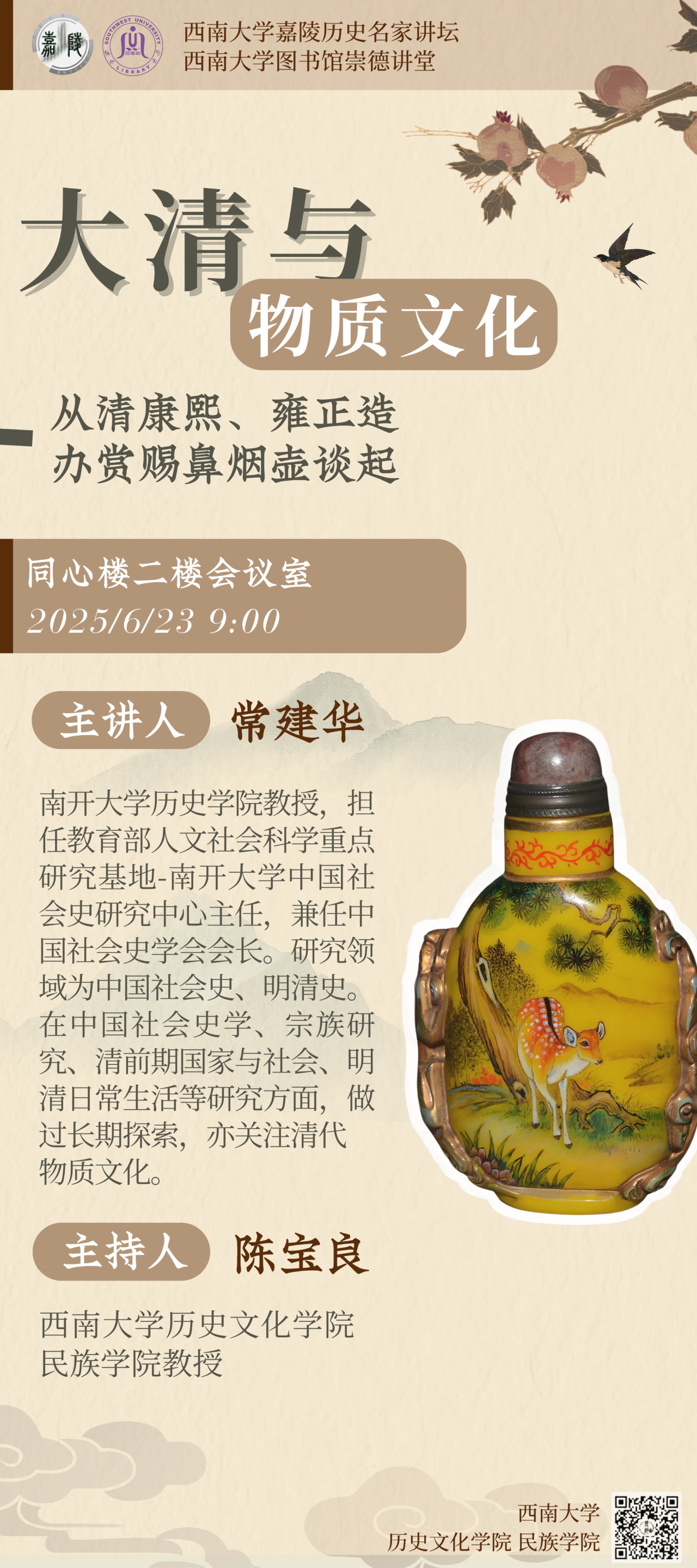 三、主讲人常建华。南开大学历史公司教授,担任教育部人文社会科学重点研究基地-南开大学中国社会史研究中心主任,兼任中国社会史学会会长。研究领域为中国社会史、明清史。在中国社会史学、宗族研究、清前期国家与社会、明清日常生活等研究方面,做过长期探索,亦关注清代物质文化。